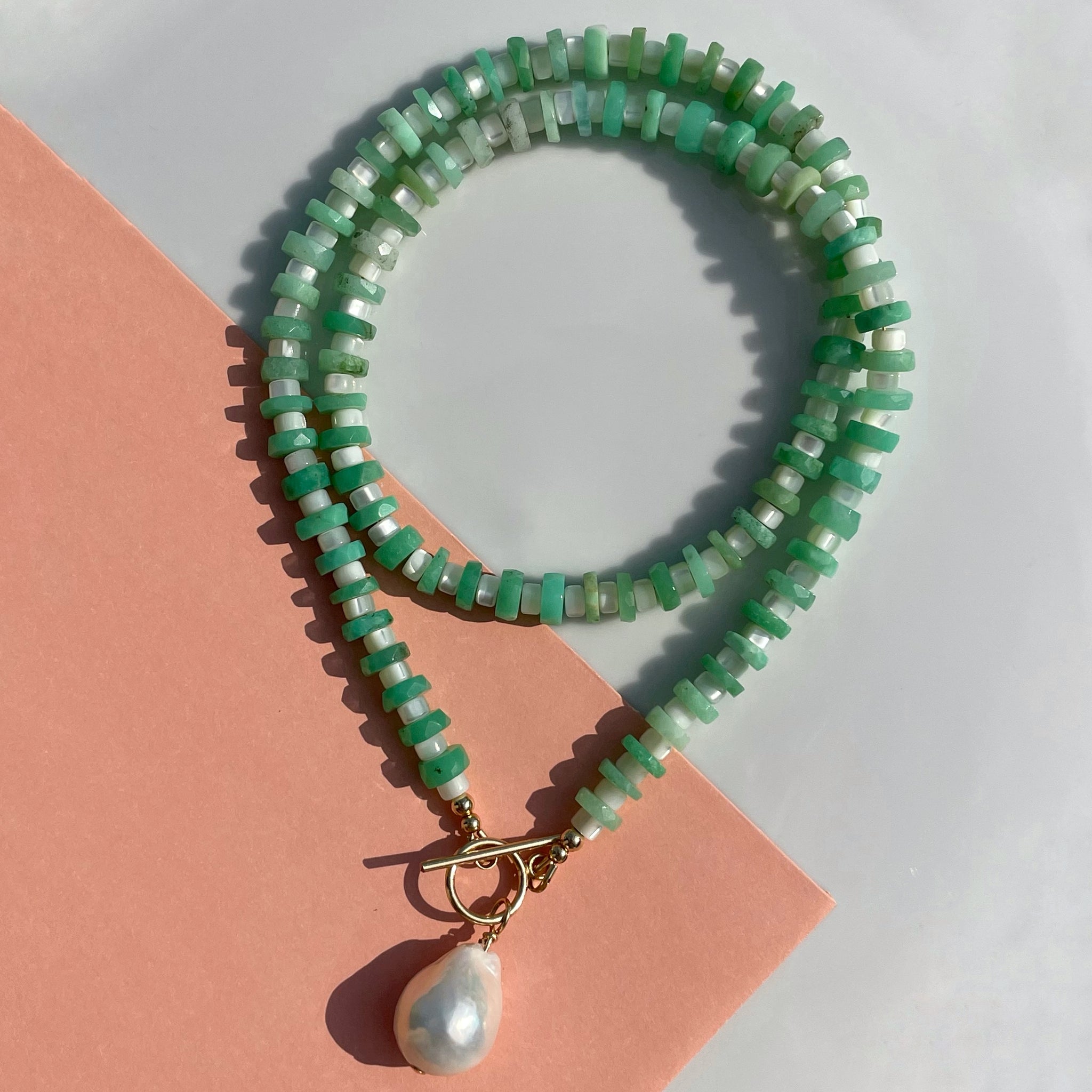 This is a one-of-a-kind design. It balances soft iridescence with earthy tones, creating a refined yet natural aesthetic Chrysoprase not only symbolizes joy, but exudes it. You cannot wear a vibrant green necklace and not feel a little happier about the color you are bringing to yourself and the world. I chose the mother-of-pearl beads to balance the necklace out. Hopefully encouraging a sense of calm in addition to the joy the chrysoprase inspires.