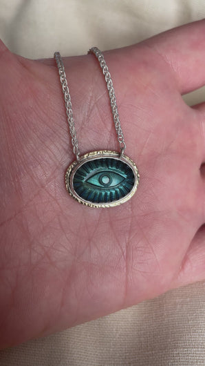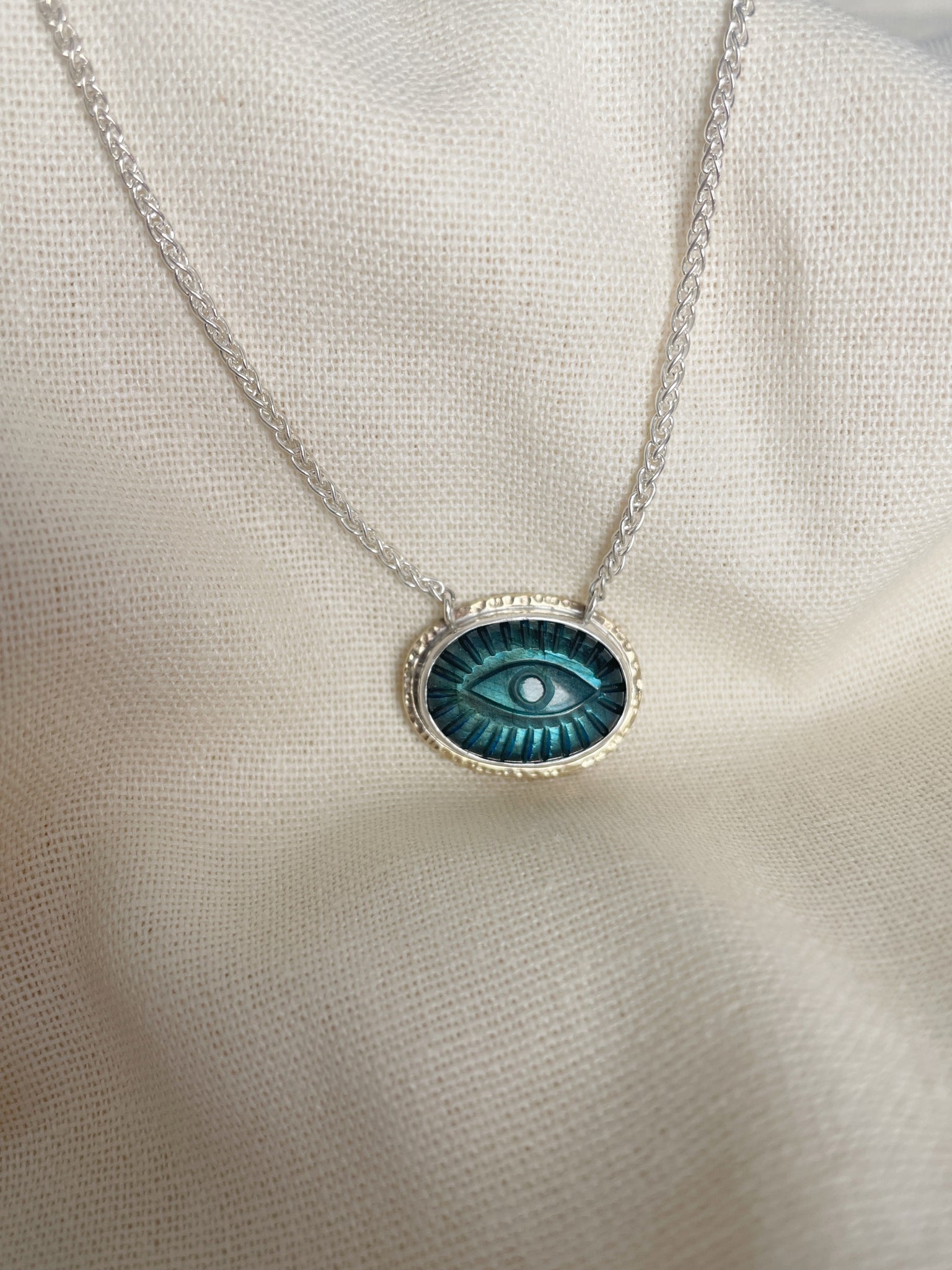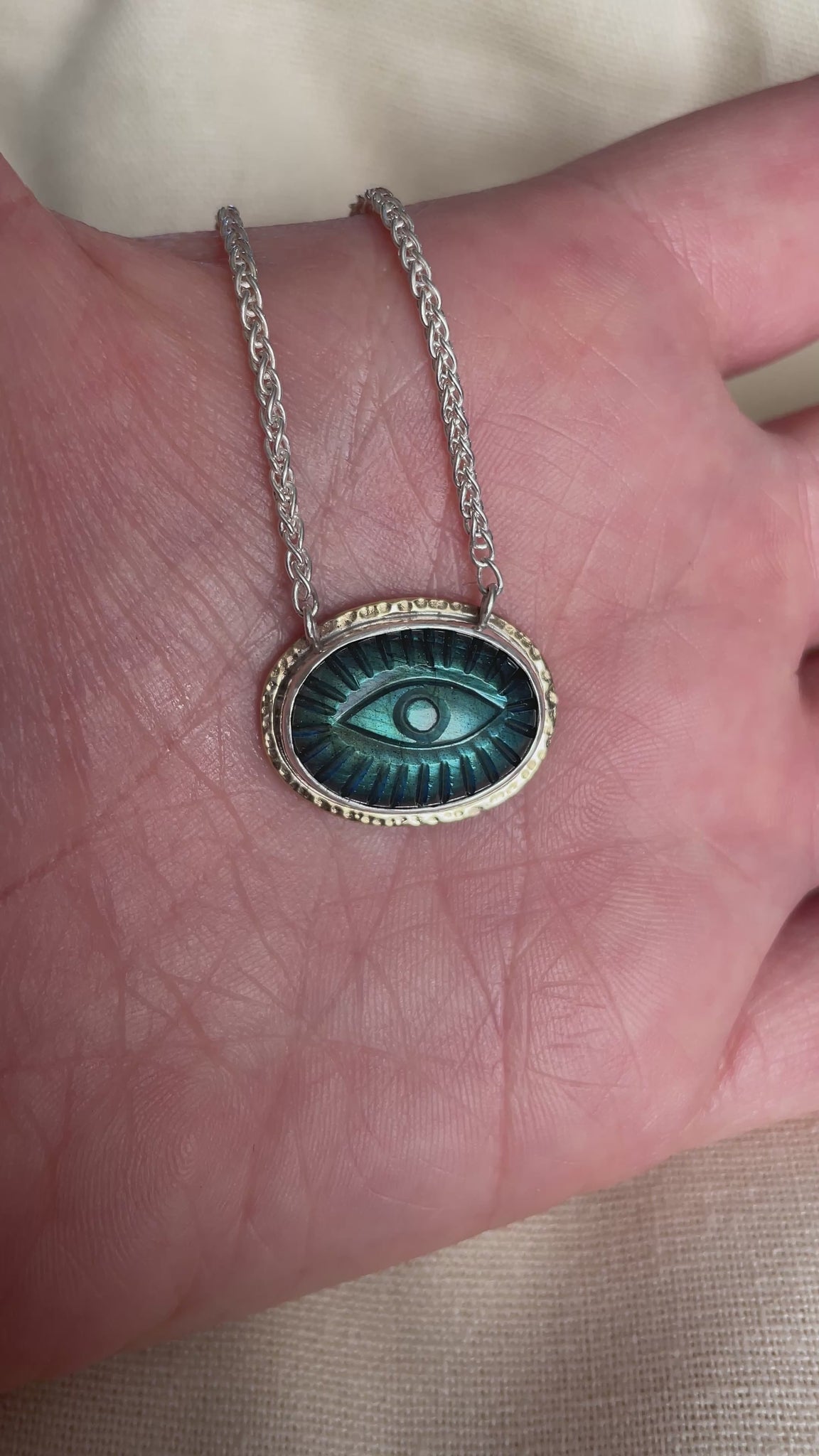 This Evil Eye Necklace features an ethically sourced and hand-carved labradorite nestled in a fine silver and hammered brass frame. The sterling wheat chain really elevates the pendant and feels pretty luxurious on the neck.