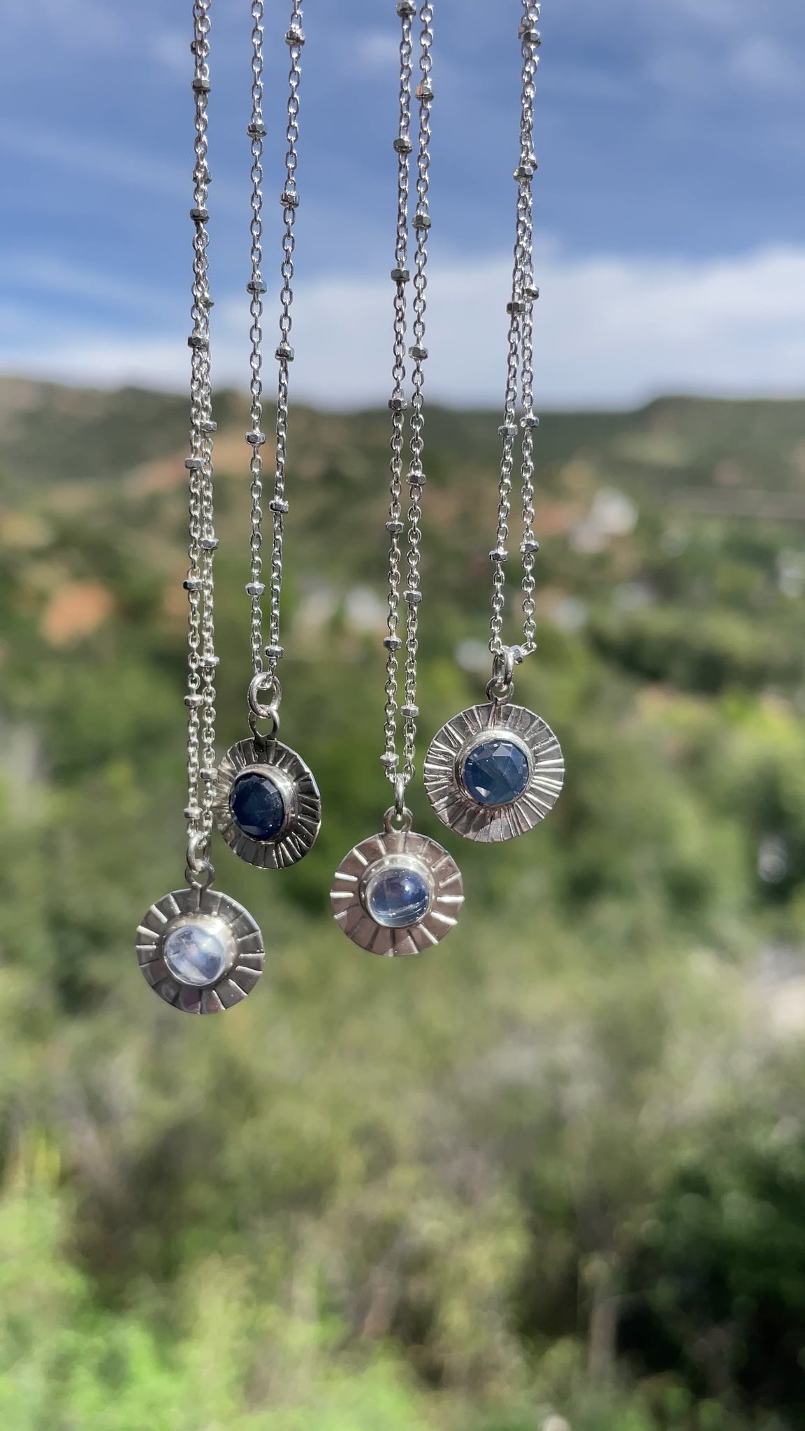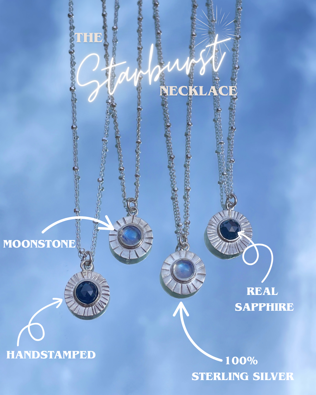 The Starburst Pendant features a small, ethically sourced gemstone nestled at the center of a hand-stamped starburst—symbolizing clarity, calm, and quiet brilliance. It’s a reminder that you don’t need to shine loudly to be radiant.